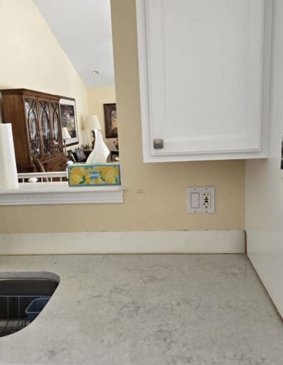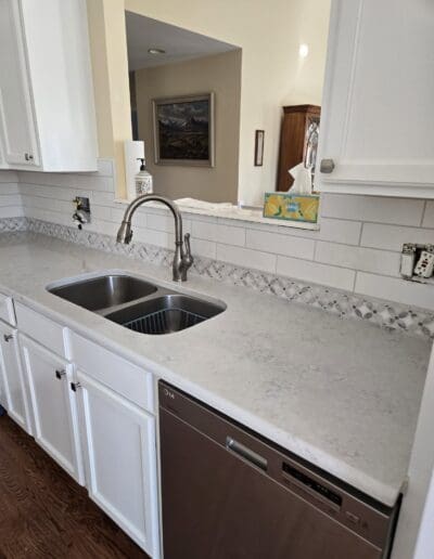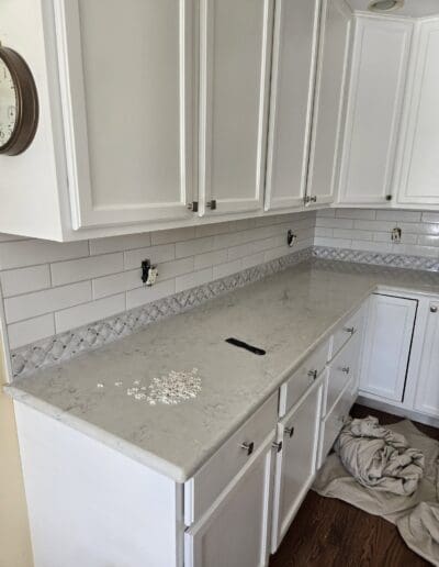 We just completed a tile backsplash for another client. We installed white 3×12 subway tile for the upper courses and 4×12 decorative flower pattern tile for the first course. the grout was light gray. our client was very happy with the resulting project.