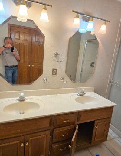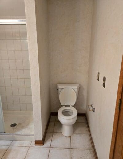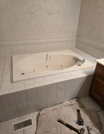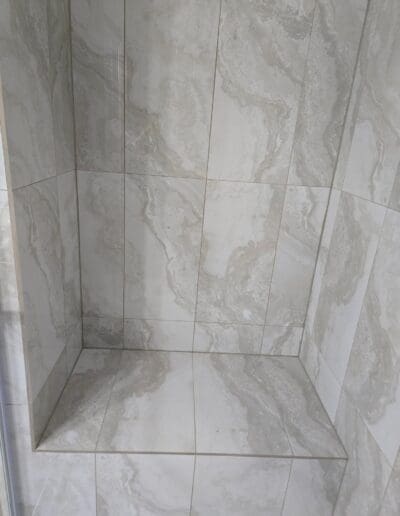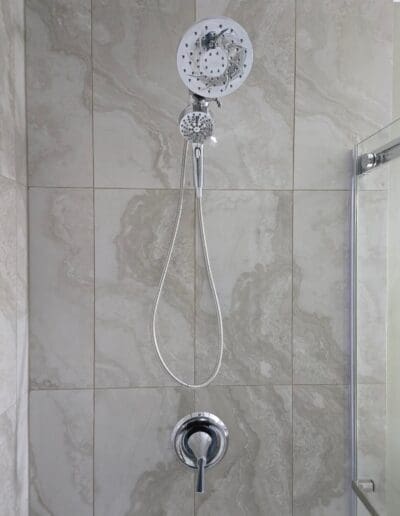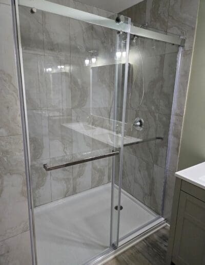 We just finished a bathroom remodel for a client. We removed the existing whirlpool tub and tiled platform and installed a 42 x 60 shower base and framed a wing wall with a bench in the shower area. The shower was then tiled with 12 x 24″ tiles set vertically and shower doors were installed. The existing shower was removed and converted into a linen closet. We also installed new mirrors, lights, vanity, LVT flooring and PVC baseboard and shoe. The existing double door entrance to bathroom was removed, framed down and converted into a barn door.