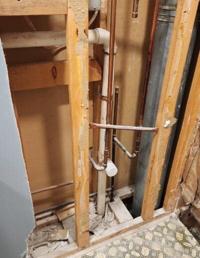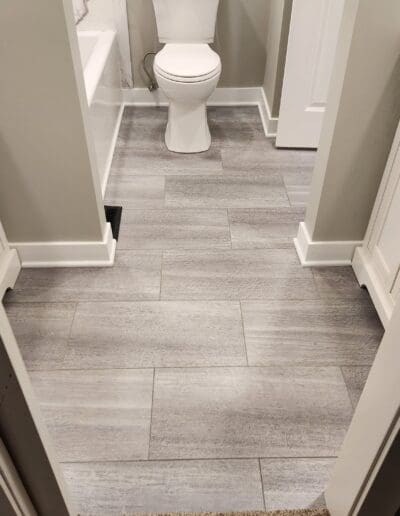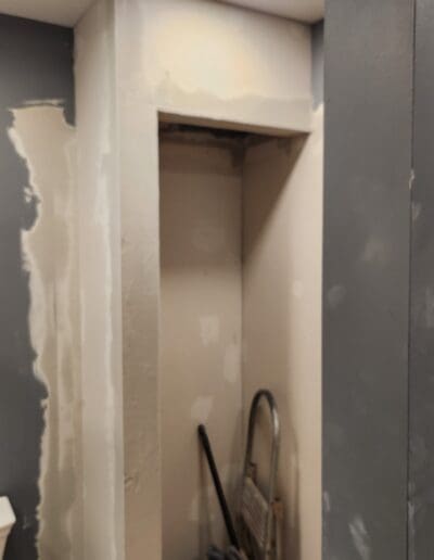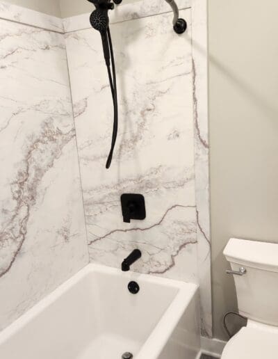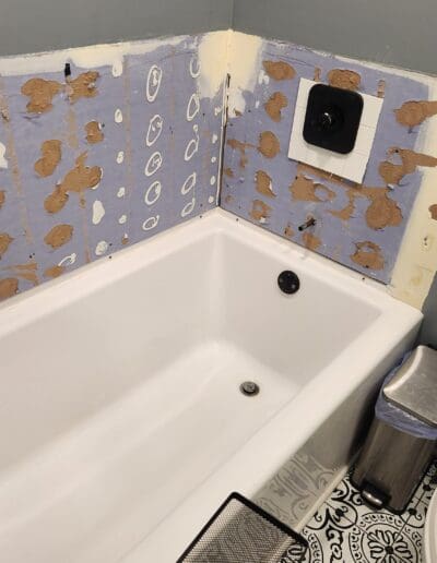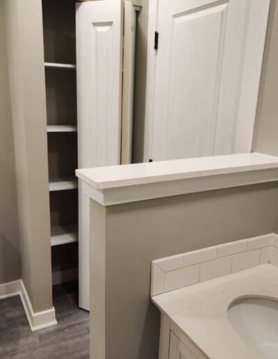 We just finished a bathroom remodel for a client that had a shower and tub in the same area of the bathroom. They requested that the shower be removed so that a linen closet and door could be built in that area. They also wanted the tub to be converted so that a shower could be added to the tub. They also wanted a wing wall to be lowered to 42″ to allow more light into the area with 2 vanities. To do this we had to remove the plumbing and drain from the shower area and add shower plumbing to the tub. We raised the floor in the shower area and installed new flooring, painted the wall and ceiling, added a shower surround, built the linen closet and installed a new door.
